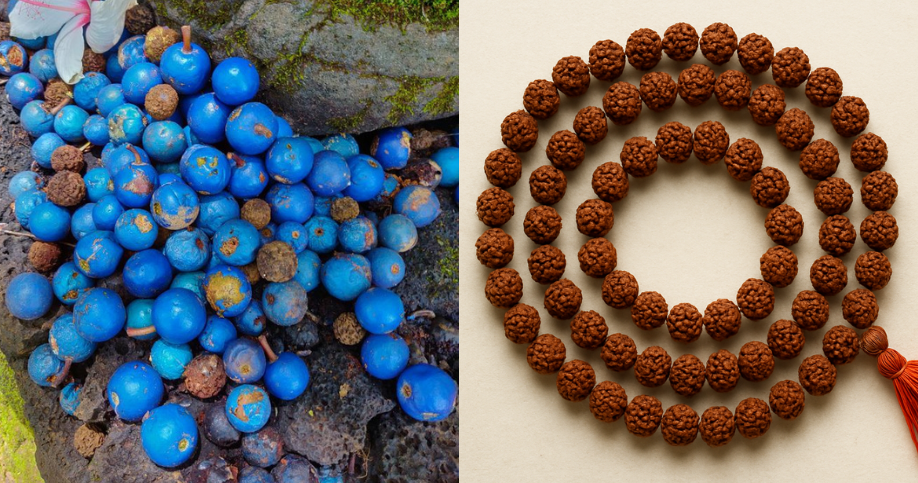 Rudraksha is the dried seed of Elaeocarpus ganitrus, a sacred tree mainly found in Himalayan regions and Southeast Asia, primarily used in malas for meditation and daily wear.